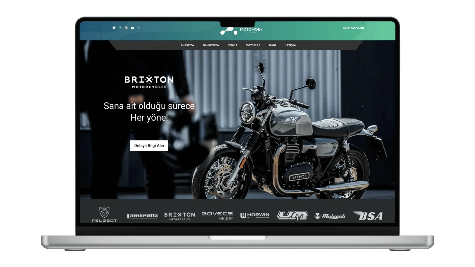 MotoMoby Garage, Kocaeli merkezli motosiklet ekspertizi ve satış hizmeti sunan bir marka olarak, müşterilerine geniş model yelpazesi ve profesyonel destek sunuyor. Modern, kullanıcı dostu ve kurumsal bir web platformuyla dijitalde etkili bir imaj oluşturduk.